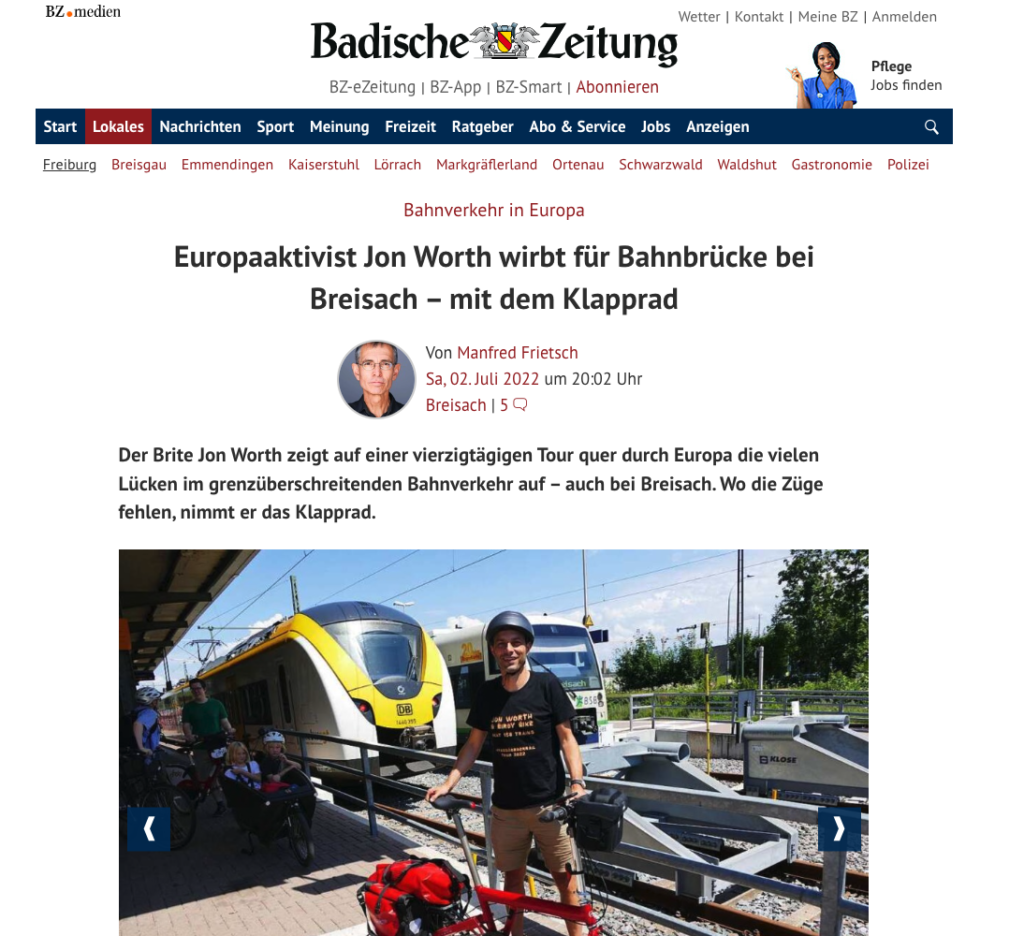 “Der Brite Jon Worth zeigt auf einer vierzigtägigen Tour quer durch Europa die vielen Lücken im grenzüberschreitenden Bahnverkehr auf – auch bei Breisach. Wo die Züge fehlen, nimmt er das Klapprad.”